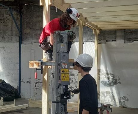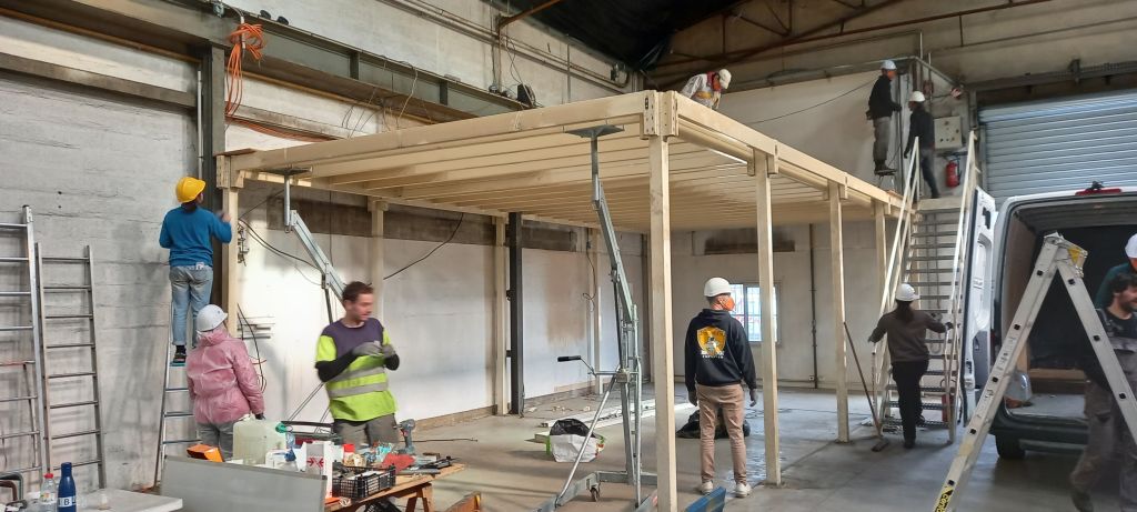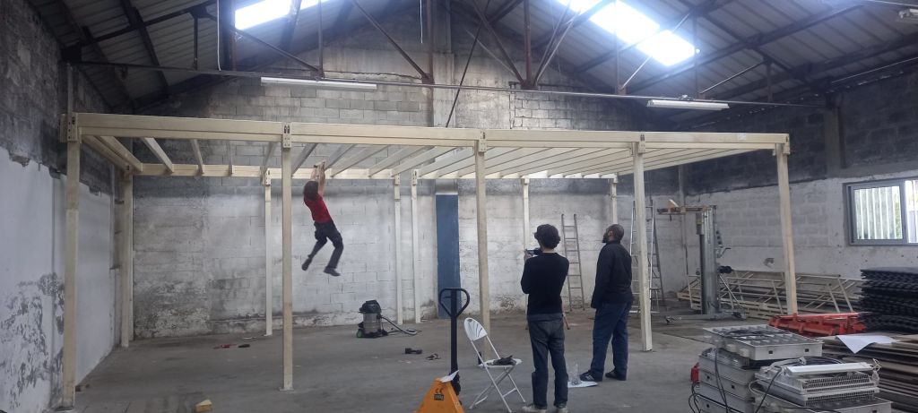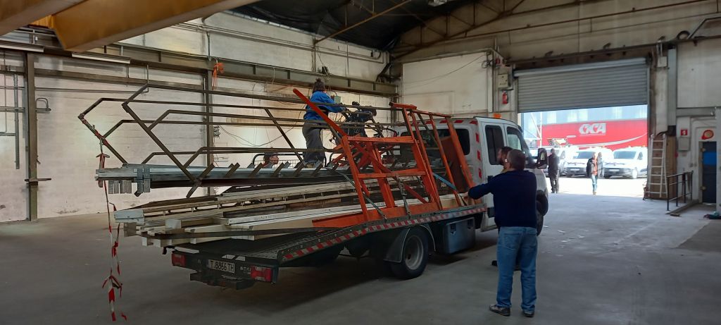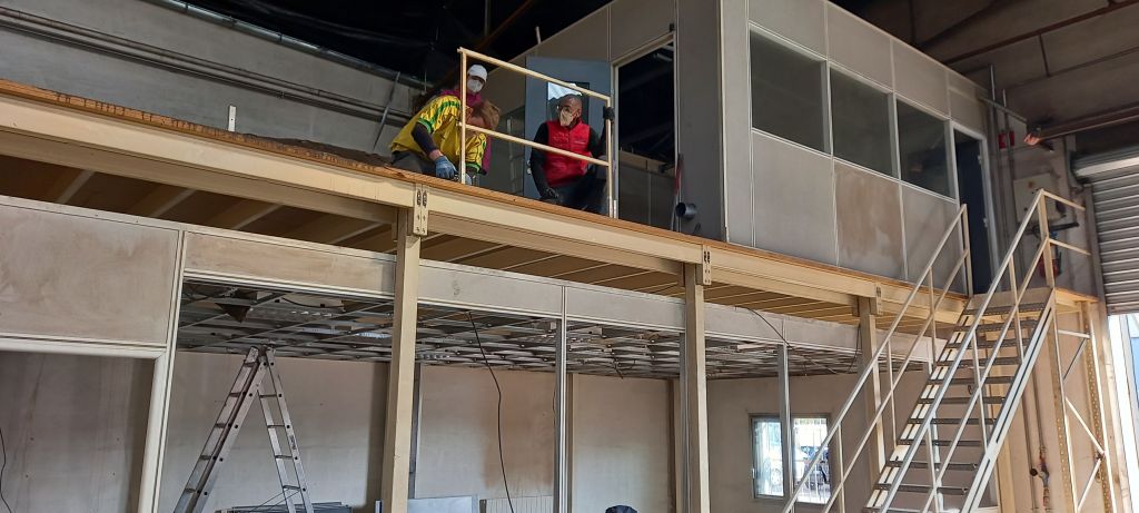 Le choix est fait d’installer une mezzanine pour le rangement du stock de pièces et de matériel divers. L’équipe se lance dans le démontage et le transport d’une mezzanine et de blocs de vie en février 2025.