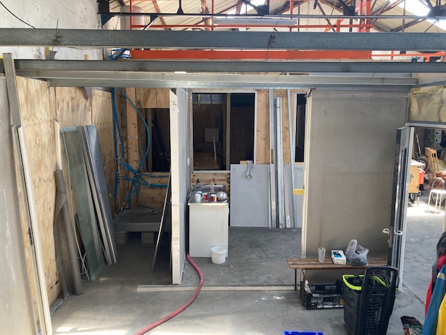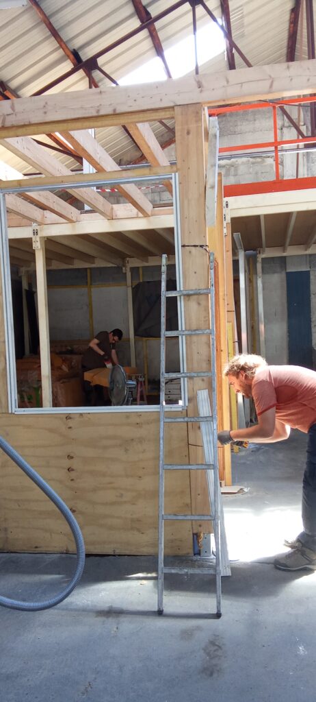 Le coin cuisine et le vestiaire (équipé d’une douche !) prennent forme