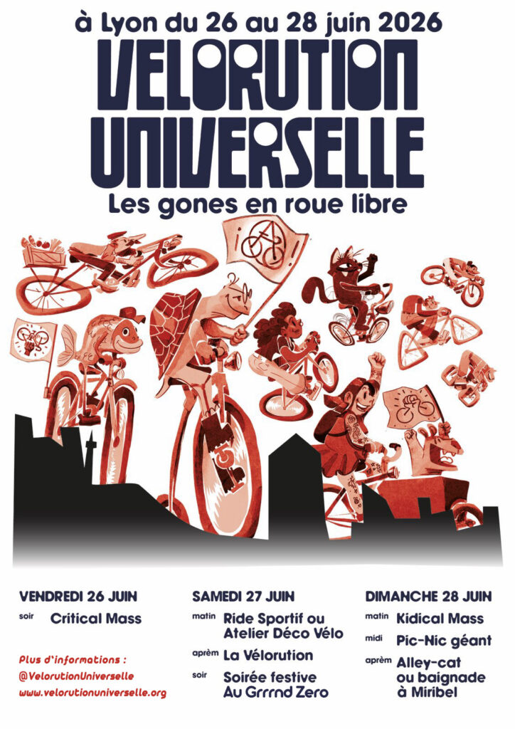 Cette fois ci le tour finira en fête à l’atelier du Chat Perché (207 Rue Marcel Mérieux) pour une soirée de soutien à l’organisation de la Vélorution Universelle de juin 2026 qui aura lieue à Lyon !